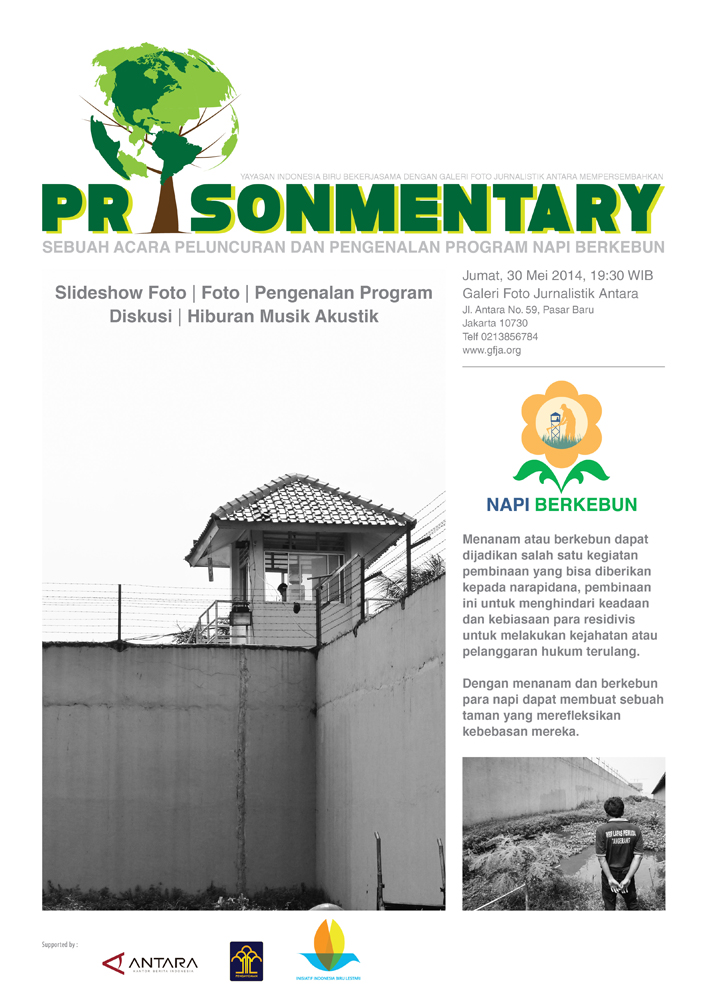 Yayasan Inisiatif Indonesia Biru Lestari (Yayasan Biru disingkat “YB” dibaca “Waibi”) yang didukung oleh Galeri Foto Jurnalistik Antara (GFJA) mempersembahkan PRISONMENTARY, sebagai acara pengenalan dan dukungan kegiatan Terapi Hortikultura dan Budidaya Tanaman Hortikultura untuk Narapidana yang dinamakan Napi Berkebun.