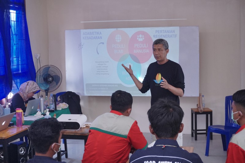 Materi pelatihan pertama yaitu “Konsep Berkesadaran Diri (Mindfulness) yang Selaras dengan Alam” oleh Lusi Ismail yang mengajarkan hubungan antara mindfulness, peduli alam dan pertanian di dalam pelatihan ini. Pemberian materi ini bertujuan untuk meningkatkan kesadaran peserta akan pentingnya “berkesadaran diri” yang selaras dengan alam dan pentingnya pertanian regeneratif dalam sistem pangan. Materi selanjutnya disampaikan oleh Khaerul Anam selaku Ketua II WAIBI, beliau menyampaikan materi tentang “Perkenalan Pertanian Regeneratif Berbasis Ekonomi Sirkular: Dasar-dasar, Etika dan Prinsip”. Tujuan dari materi ini yaitu agar peserta dapat mengenal dan memahami pertanian regenerative berbasis ekonomi sirkular (falsafah menyatu dengan alam, prinsip-prinsip ekonomi sirkular, etika dan prinsip pertanian regeneratif, serta sistem pangan regeneratif).