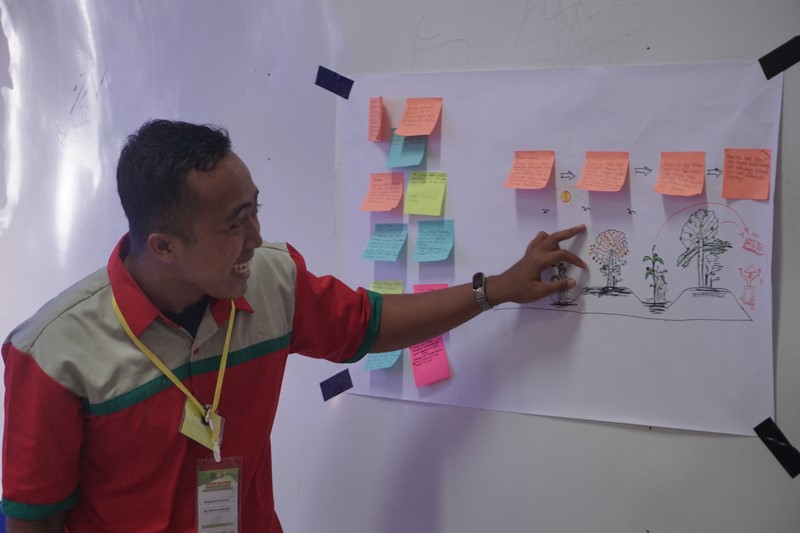 Pelatihan hari kedua dilanjutkan dengan pemberian materi “Pengenalan Sistem Tanam Three Sisters pada Komoditas Jagung” dan juga “Pengenalan Desain Pertanian Regeneratif” oleh Khaerul Anam. Peserta diajarkan bagaimana cara menanam jagung dengan sistem tanam three sisters yang selaras dengan alam, menjadikan tanaman sebagai mulsa organik dan tidak menggunakan mulsa plastik sama sekali. Selain pemberian teori, peserta juga diajak langsung untuk melakukan praktek tanam three sisters pada komoditas jagung.