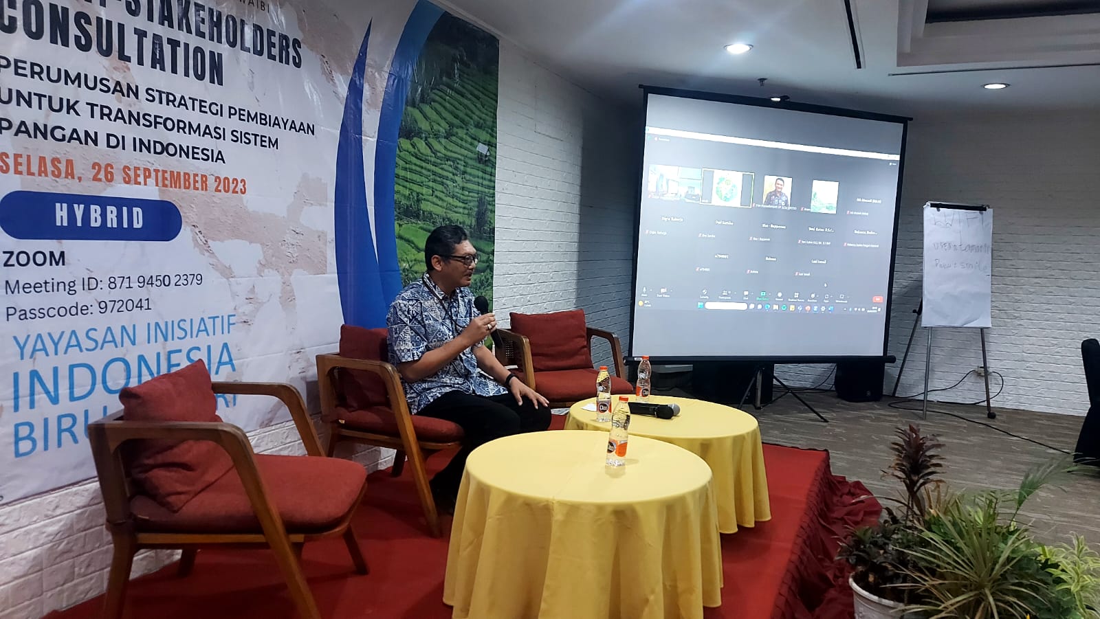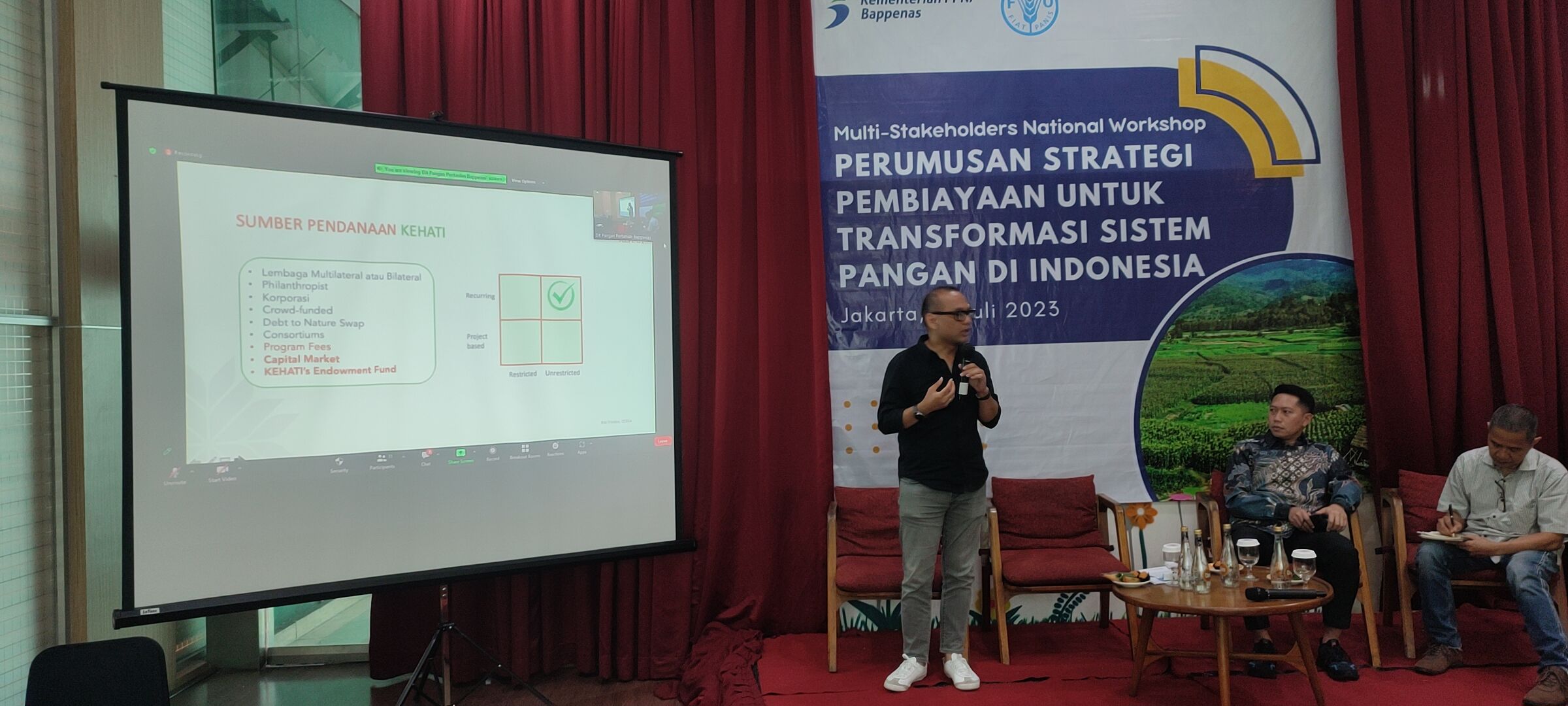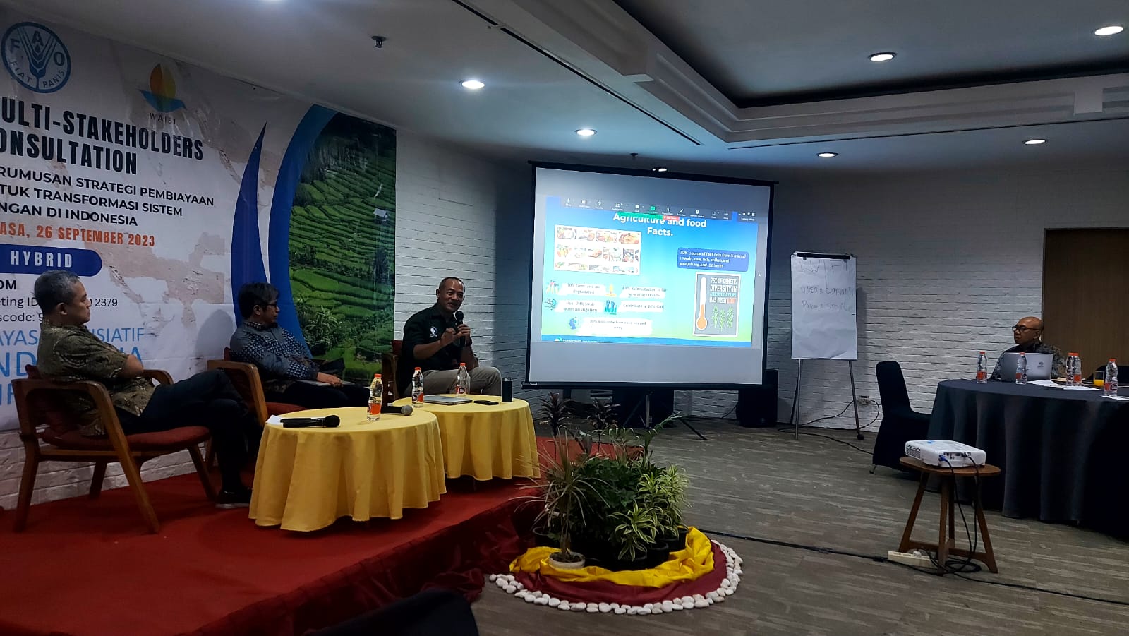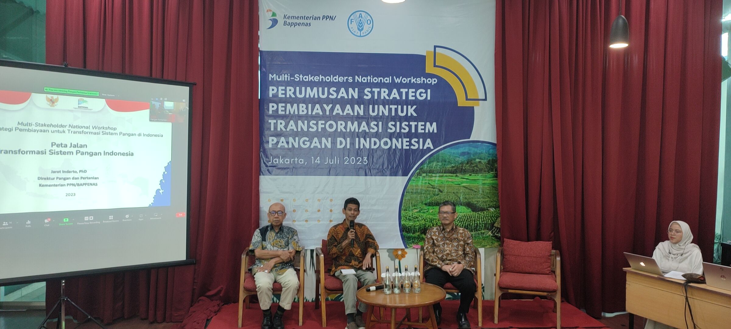 Kegiatan ini dilaksanakan pada tanggal 14 Juli 2023 di Hotel Ibis Tamarin, Jakarta dan dihadiri oleh perwakilan FAO, UNEP, World Bank Indonesia, Asian Development Bank (ADB), Kementerian PPN/ BAPPENAS, Kementerian Keuangan, Kementerian Pertanian, Kementerian Lingkungan Hidup dan Kehutanan, Badan Pangan Nasional, Bank Rakyat Indonesia (BRI), Danone Indonesia, Indonesia Business Council for Sustainable Development (IBCSD), Partnership for Indonesia’s Sustainable Agriculture (PISAgro), Yayasan KEHATI Indonesia, IPB University, Universitas Indonesia dan Yayasan Inisiatif Indonesia Biru Lestari (WAIBI).