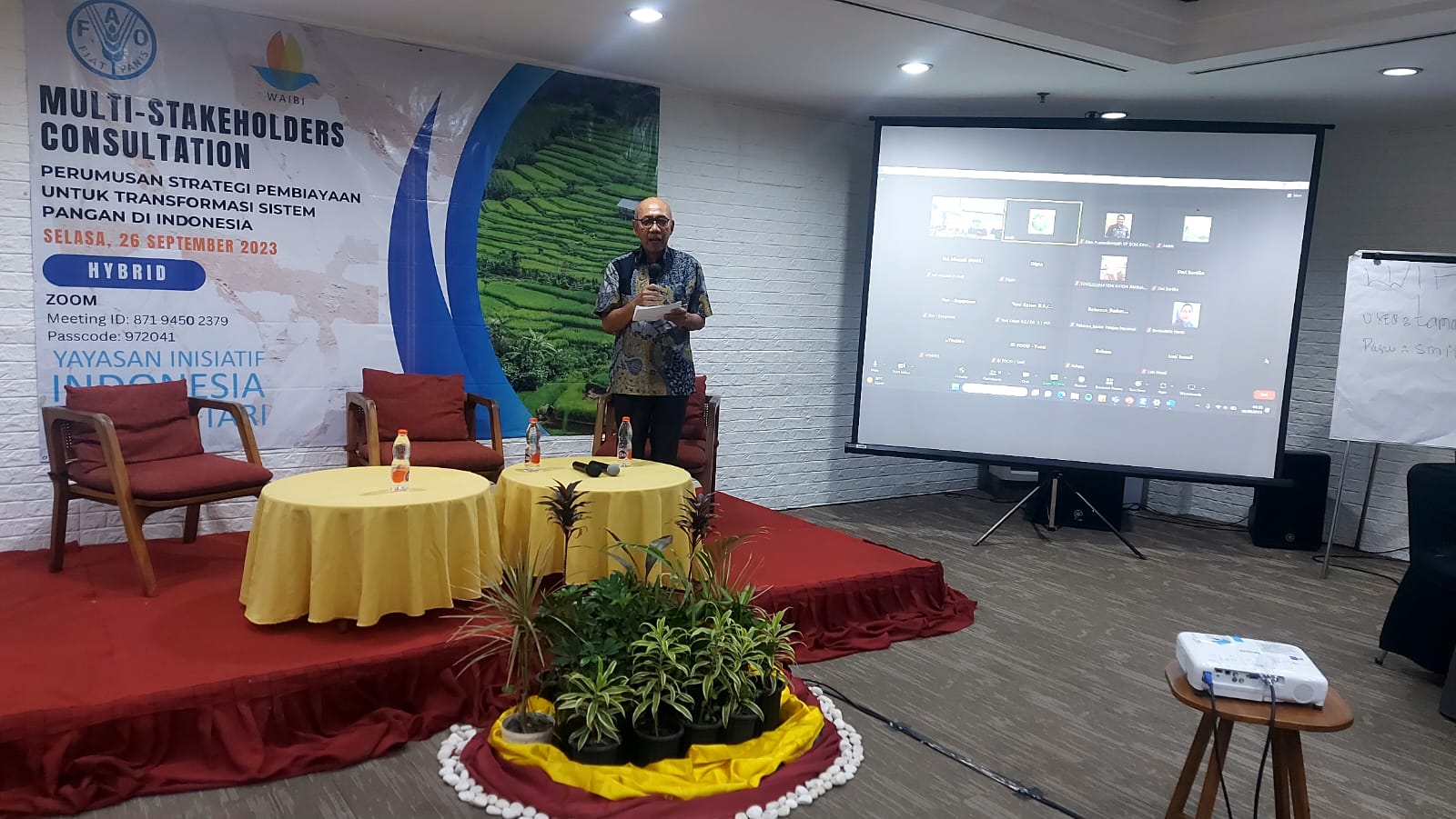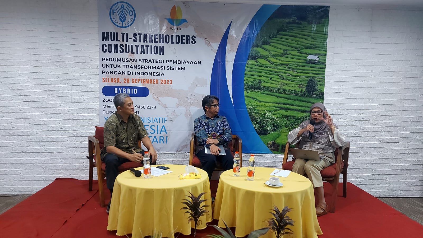 Kegiatan ini dilaksanakan pada tanggal 26 September 2023 di Hotel Tamarin Jakarta dan online zoom meeting serta dihadiri oleh perwakilan FAO, Kementerian PPN/ BAPPENAS, Kementerian Keuangan, Kementerian Pertanian, Badan Pangan Nasional, Kementerian Desa, Pembangunan Daerah Tertinggal dan Transmigrasi., Danone Indonesia, ID Food, Food Bank of Indonesia (FOI), Rikolto Indonesia, Yayasan Penabulu, Jejaring Pasca Panen untuk Gizi Indonesia (JP2GI) dan Yayasan Inisiatif Indonesia Biru Lestari (WAIBI).
